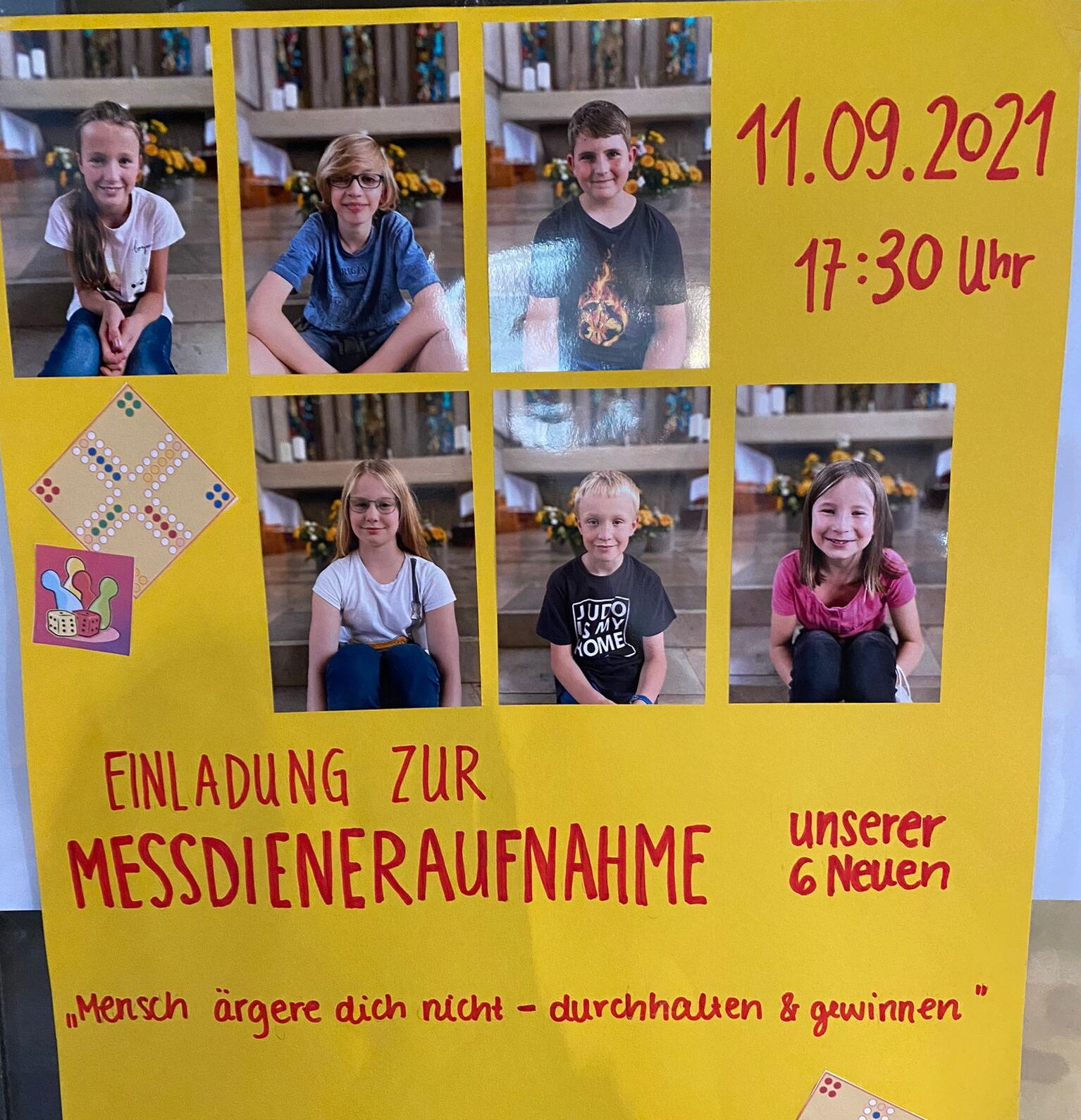 Am 11.09. nehmen wir 6 neue Kinder als Messdiener*innen in unsere Gemeinschaft auf. Dazu findet um 17:30 ein Gottesdienst unter dem Motto „Mensch ärgere dich nicht – durchhalten & gewinnen“ statt. Platzreservierung erforderlich!